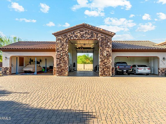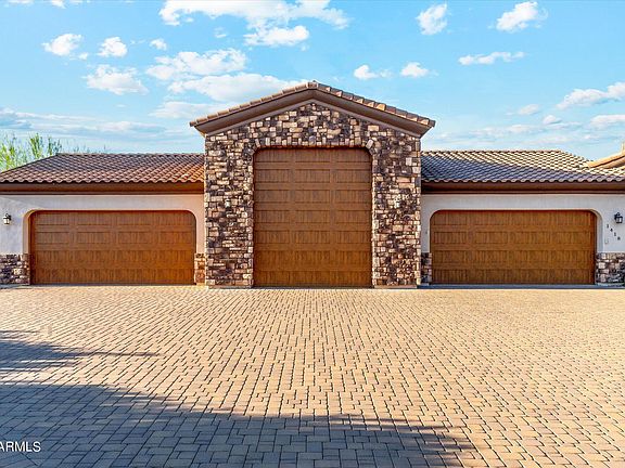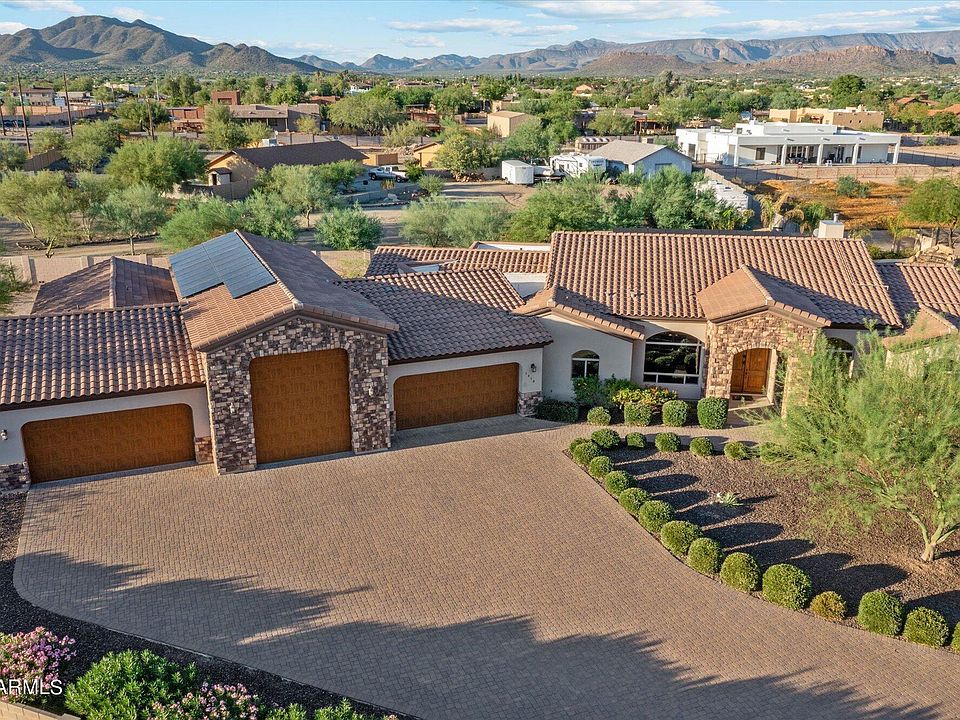 Luxury custom home, on a sprawling one acre gated lot, w/mountain views, nestled at the end of a private road. Owned 42 panel solar system. 2,500sqft -10 car garage, with A/C, drive-thru RV garage (+backyard RV gate), 30 amp(2), &50 amp outlets. Attached casita w/full bathroom, men's urinal, kitchenette & private porch. Main home features massive chef's kitchen, double island (w/double sinks), custom cabinets, gas stove, pot filler, double-oven, walk-in pantry, double-wide built-in Whirlpool fridge & freezer. Main suite w/private porch, large spa bathroom w/double sinks, jetted tub, & large walk-in closet. All bedrooms are on-suite w/full bathrooms & walk-in closets. Backyard is your desert oasis with lush mature landscaping, sunset mountain views, custom built in pool & spa w/waterfalls.