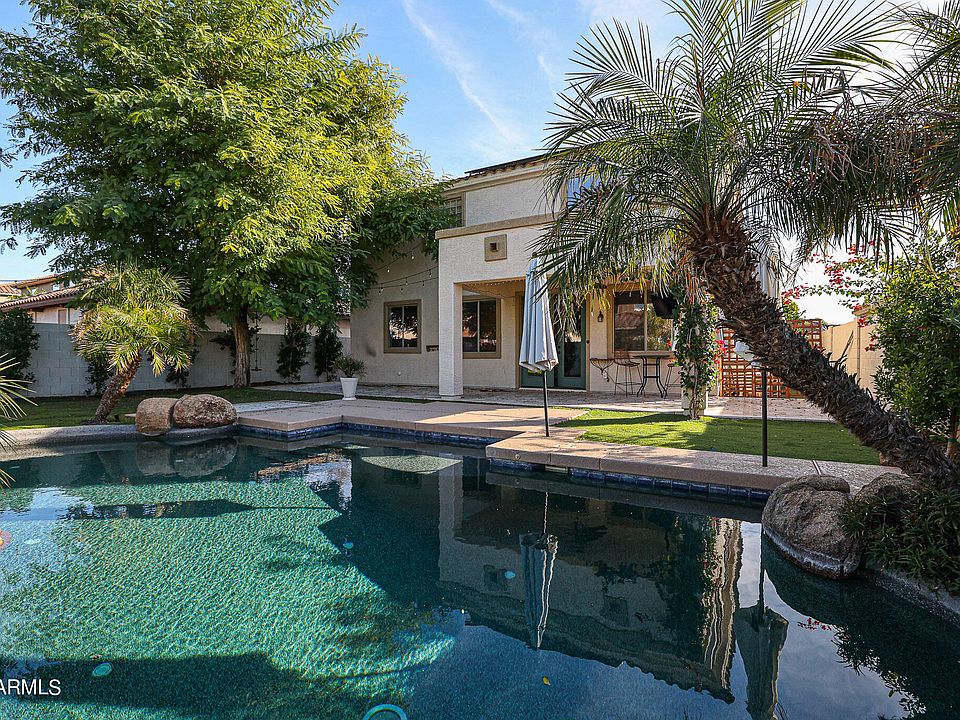 Spacious 5 Bedroom with a Bedroom/Den downstairs and full bath! Could be used as an office or den. Leased Solar to help with those summer bills! Large formal living/dining with vaulted ceilings. Tile in all the right places and upgraded carpet throughout bedrooms. Large family room with media niche and electric fireplace. Open kitchen with quartz countertops, kitchen island and painted cabinetry. Refrigerator is included! Entertainers dream backyard with sparkling pool, covered patio and mature landscaping & citrus trees! Walk upstairs to your large master bedroom/bath. Additional bedrooms have laminate flooring. Downstairs laundry with washer & dryer that convey. 3 Car Tandem Garage with storage cabinets! Close proximity to grocery stores, AMC & Uptown Alley!