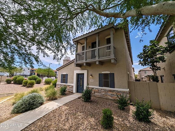 Large great room adjoins kitchen with custom cabinets, tiled backsplash, center island, and upgraded granite counters. Gorgeous hardwood flooring throughout downstairs, stone fireplace in family room. Full bath on ground floor near downstairs bedroom. Loft space perfect hang out, study, or play area. Master suite has spacious walk in closet, beautiful views from balcony. Master bath features dual vanities, separate soaking tub & shower. Jack & Jill bath joins guest bedrooms. Side courtyard features extended paved patio, desert landscaping, space for entertaining. Back patio table and chairs will stay. Massive community greenbelt, community pool, & parks nearby.