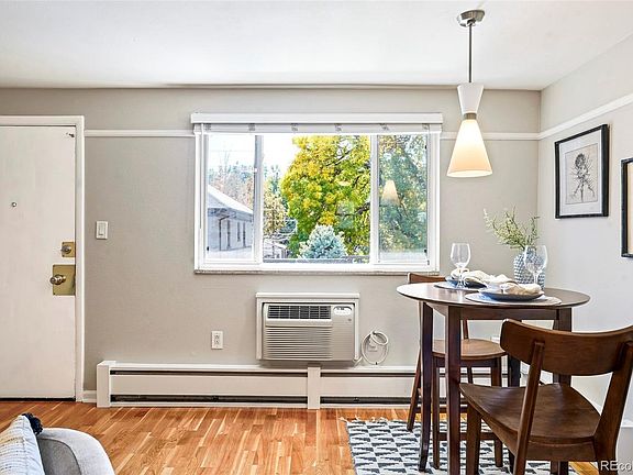 A coveted opportunity awaits in this top-floor Congress Park residence. Originally converted to condos starting in 2006, this bright escape preserves its mid-century charm while seamlessly incorporating modern comforts. A distinctive touch, each residence in this building is named after a classic American car. Step inside through a sleek stainless steel door and discover a functional layout complemented by freshly painted walls. Natural light pours in through large windows, framing picturesque neighborhood views. Upgraded lighting in the living area enhances the luminous ambiance, while a chic pendant light highlights the dining area. The kitchen showcases modern stainless steel appliances, ideal for culinary endeavors. Retreat to a spacious bedroom with new carpeting and a stylish ceiling fan light fixture. A full bath features updated lighting, and the home offers the added convenience of a new washer and an included storage unit. Nestled in the heart of Denver, this building sits on a tree-lined street, just moments from shopping, dining, parks, and public transit.