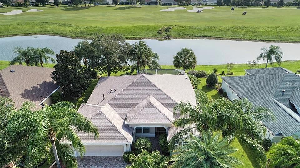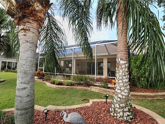 NEW PRICE. EXPANDED TO 2075 SF. Location, location.. This home is located in the sought after Village of Virginia Trace. Just a hop,skip and a jump away from Sumter Landing town square where you can enjoy dining, dancing and music every day. The gorgeous STRETCHED Gardenia over looks a pond and Mallory Hill golf course. The lovely screened lanai has beautiful landscaping and an inground hot tub (works great but sold with home asis). There is also a Summer kitchen with a gas grill that has been newly cleaned. As you enter the home through the leaded front door you will notice the awesome landscaping. There is also a coat closet in the entry. The open kitchen has a gas range, a newer refrierator, and a Bosch diswasher. The cabinets are Premier bay stacked cabinets with crown moulding. Counter tops in the kitchen are granite, and there is a nice backsplash. The bar area is perfect for entertaining! The nook area has plantation shutters and an adjustable eyebrow window. The entire home has been stretched two feet in every room as well as 4 feet width and 2 feet in length in the garage. There are lots of extra closets in this home. Each guest bedroom has closets and the Master bedroom has two extra closets due to the expanded width of the room. The Master bath has a Roman shower, dual sinks in quartz, new sinks, lights and faucets. The entire home has vaulted ceilings, crown moulding and was newly painted inside. There is a new roof in 2020, new HVAC in 2019, Hot water heater 2018. The sliders going out to the birdcage recess into the wall. Taxes $3,333.61, Fire $124, Maint $540.27, Asst bond $1,185.54, Bond Bal $11,232.12.