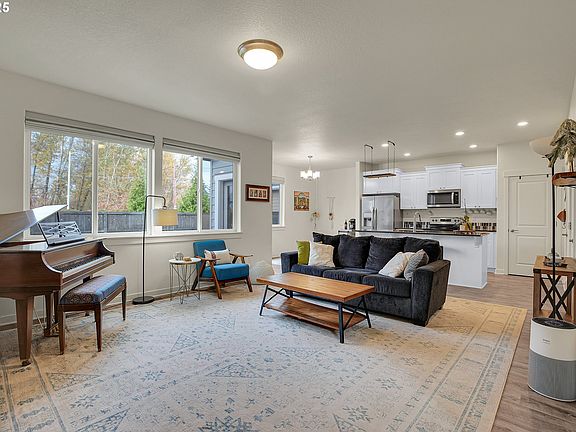 Only 5 years NEW and ready to move in. Large solid surface easy-care quartz island/eat bar, stainless steel appliances included, handy pantry, pot rack, and lots of cabinet space make this a dream kitchen that is open to the dining area and great room with a fireplace. You'll love the easy-care luxury vinyl tile flooring throughout the main level (referred to as laminate). Speed Queen washer/dryer set included, plus two overhead garage storage racks and a handy garage door opener. A fully fenced back yard with an exposed aggregate (15'x15') patio for entertaining, front/back sprinkler system to keep your grass lush, and garden space for veggies or flowers backs to a small greenway area buffer (so no neighbors behind). Enjoy the community playground, pond with occasional ducks and other wildlife, covered picnic area, and additional common spaces in the desirable Campanella Estates neighborhood. Close to schools (.5 mile), library, Wade Creek Park, and skate park (.4 mile), local shops, and eateries in the quaint small town of Estacada. 4th of July parade, Halloween downtown event, and Friday night football games are a must! Boating, kayaking, fishing, and hiking can be experienced at nearby Estacada Lake, Promontory Park, Northfork Reservoir, Timber Park, McIver Park, Metzler Park, etc... Estacada really has a lot to offer.
