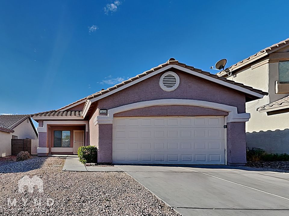 Welcome home to this great 3-bedroom, 2-bathroom property offering 1,268 sq ft of comfortable living space. The open living room flows into a well-equipped kitchen that features a convenient serving window and a breakfast bar with seating. A full suite of appliances is included for all your culinary needs. The primary bedroom is a private retreat with a walk-in closet and an en-suite bathroom boasting dual sinks. A dedicated laundry area with washer and dryer hookups adds everyday convenience. Enjoy the outdoors from your private porch or patio. You'll also benefit from ample parking with two covered spaces in the attached 2-car garage. Located with easy access to US-95 and I-15, this home is a must-see. Schedule your tour today!