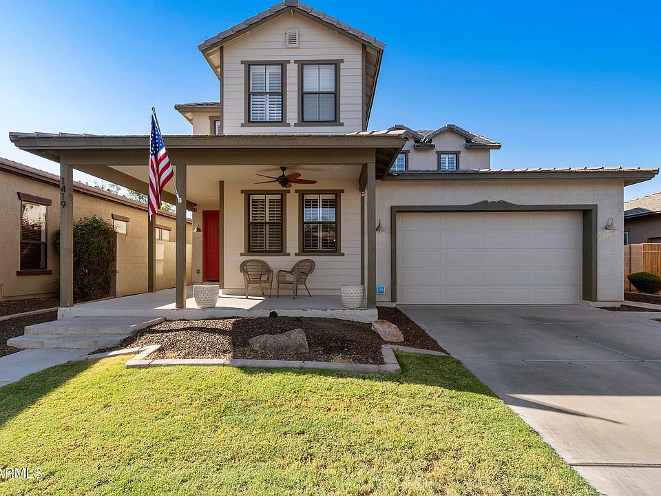 Beautiful 4-bedroom, 3-bath home in Homestead Park, Chandler! Features plantation shutters throughout and a spacious kitchen with granite countertops, island, ample cabinetry, and stainless steel appliances. The primary suite is conveniently downstairs, along with a versatile bonus room—perfect for an office, gym, or hobby space. Upstairs you'll find three bedrooms, two full baths, a large loft, and laundry room. The backyard offers a covered patio and a generous grass area, with winter grass recently planted and coming in lush.