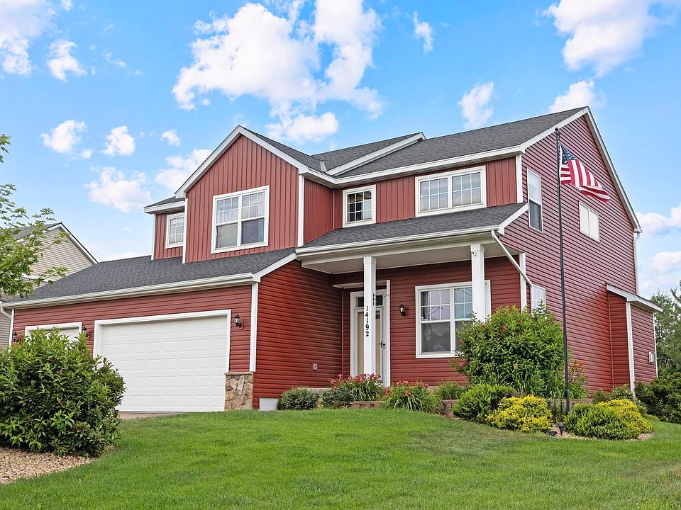 Compare the value this 3,772sf, 5-bedroom, 4-bathroom home has to offer. The open-concept main floor showcases hardwood floors, brand new carpeting throughout the entire house, a cozy fireplace, a bright sunroom that overlooks a large back yard, a convenient laundry room situated right off the garage, and a kitchen with generous countertop and cabinet space. Large windows flood this home with natural light throughout the day. Upstairs you will find a wide hallway leading to four generously sized bedrooms and a versatile 18x13 bonus room with wood flooring and glass French doors. The primary suite offers a walk-in closet and private bathroom with double sinks, soaking tub, and separate shower. This layout provides a perfect combination of open and private spaces with plenty of family spaces on all three levels. The lower level has the fifth bedroom, flex room, full bathroom, and additional family/ recreation room. Located in the top-rated Rosemount-Apple Valley-Eagan School District (ISD 196) and just steps from Bloomfield Park, featuring scenic walking trails, basketball and tennis courts, playgrounds, and green spaces perfect for family outings and community events. New carpeting throughout installed on 7/12/25. Savor views of the beautiful backyard from the sunroom and expansive deck. This package is complete with a massive paver patio and built-in fire pit. The storage shed and garden box are included. Entire HVAC System inspected, satisfactory Radon Test in hand, and sewer scope completed to add to the value this large home offers. Minimal HOA fee covers common grounds, plowing sidewalks, and some basic landscaping.