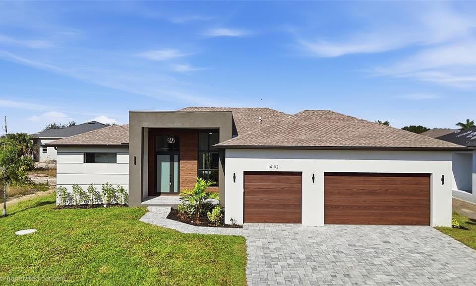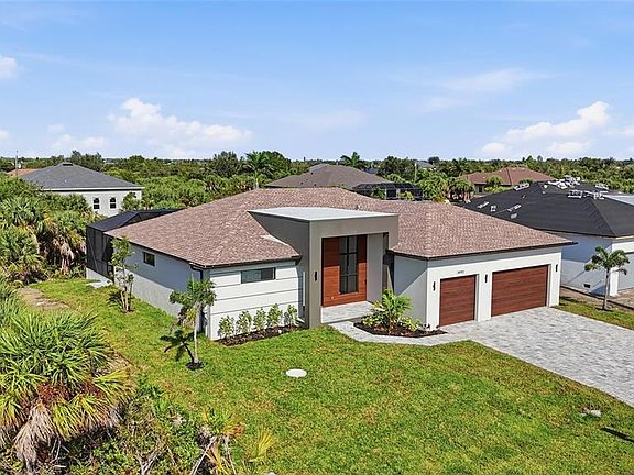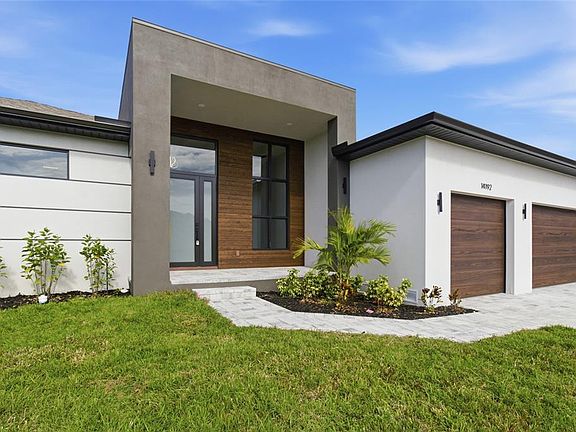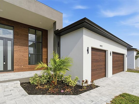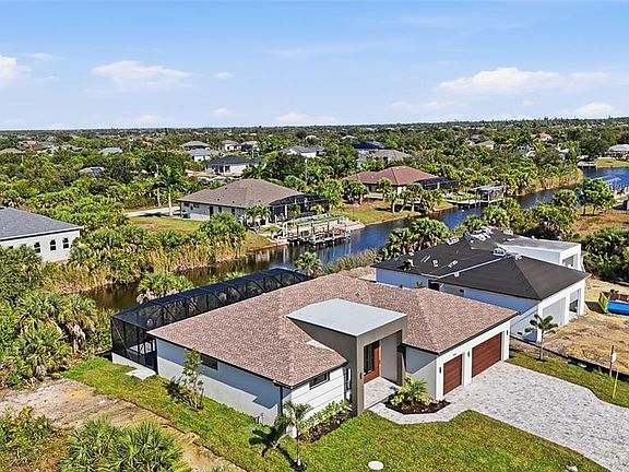 This exceptional brand-new custom-built residence showcases modern elegance and quality craftsmanship throughout. A paver driveway, grand entrance and floor-to-ceiling windows with slatted wood accents introduce the refined design within. Set on a saltwater canal with direct Gulf access in the sought-after South Gulf Cove community, this three-bedroom plus office, three-and-a-half-bathroom home offers elevated living and thoughtful functionality. Inside, soaring volume ceilings, eight-foot doors and designer wood plank tile flooring create a bright, sophisticated atmosphere. The living room features a tray ceiling with recessed lighting and a three-panel sliding glass door that opens to the covered lanai for seamless indoor-outdoor flow. The primary suite offers a serene retreat with lanai access, two walk-in closets and a spa-inspired bathroom with dual vanities, quartz countertops and a tiled shower with dual showerheads. Two additional bedrooms feature private ensuite bathrooms. The chef’s kitchen is appointed with high-end stainless steel appliances, a tile backsplash, walk-in pantry and a waterfall-edge quartz island accented by pendant lighting. Gold hardware throughout adds a refined modern touch. Hurricane-impact windows and sliding glass doors provide year-round peace of mind. Outdoor living is equally impressive, offering a covered lanai, summer kitchen, outdoor shower and a pool and spa with a sundeck. A sixty-foot paver pool deck and upgraded cage complete this exceptional setting. The oversized three-car garage provides abundant storage and additional flexibility. Located minutes from beaches, golf courses, marinas and coastal recreation, this 2,014-square-foot residence lives even larger with its open design and soaring ceilings. South Gulf Cove offers two boat ramps, five parks and convenient golf cart access, creating an ideal waterfront lifestyle. This remarkable home blends luxury, comfort and craftsmanship in a premier coastal location.