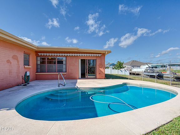 Direct Canal Front 2 Bedroom 2 Bath 2 Car Garage Pool Home with direct Intracoastal Waterway Access. Sitting up high and dry, the home is situated on a generous 80' x 150' lot in the coveted Flood Zone X. Enter the home to an open floor plan with immediate water views. Continue back to the enclosed Florida room overlooking the canal, kidney shaped pool (installed in 2015) and Boat House! The lush backyard is fully fenced and features a detached 10 x 12 storage shed. Roof 2025 / AC 2008 / Solar HWH 2009. A boater's dream, this home is located just 9 miles from Ponce Inlet. Imagine the possibilities from your backyard! Square footage from tax rolls. All information intended to be accurate, but cannot be guaranteed.