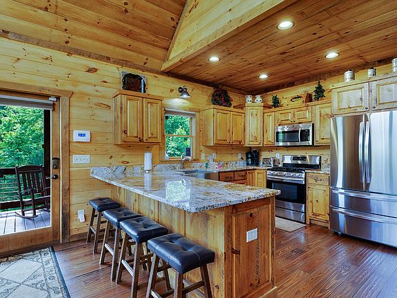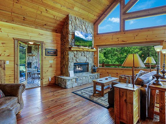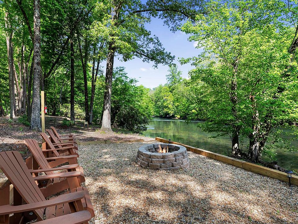 ~Down by the River~ Luxury vacation cabin perched above the Scenic Blue Ridge railway with 130ft of level frontage on the Toccoa River. Meticulously maintained inside and out. Rustic all-wood interior with mountain laurel railing and custom hand-hewn staircase, upgraded granite countertops throughout, and king-size bedrooms on each level. Open great room layout with several picture windows allowing river views and tons of natural light. An upper level master retreat with walk-in tile shower and walk-in closet. The full finished lower level is complete with media/gameroom and wetbar. Tons of outdoor areas including screened living area with fireplace, 2 firepit areas (one riverside), and hottub patio. Furnishings available for additional cost. Easy location off all paved roads between Blue Ridge and McCaysville. Current vacation rental with strong rental projections for 2023.