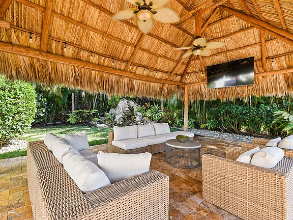 Welcome to this beautifully renovated home in the sought after community of Rialto. You will be delighted to entertain your family and friends in your tropical backyard oasis complete with an oversized tiki-hut with electric, lush landscaping, a waterfall, Saturnia pavers, summer kitchen, and a view of the lake. There is plenty of space to build your custom pool. The kitchen is open to your family room and is updated with white cabinets, granite, stainless appliances. You will enjoy wood floors, volume ceilings, as well as a split floorpan. The master suite offers a large walk in closet with built-ins. The front bedroom is also an ensuite, ideal for your guests. This home has been freshly painted inside and out. Other features include IMPACT GLASS, a 3 car garage with a finished floor, generator ready electric box, an alarm system with outdoor cameras, and a fully fenced in yard. Amenities include a resort style community pool, tennis, clubhouse, gym, playground, kids splash park, basketball and more. Lawn care in the front and back is included in your HOA fees. Rialto has an active social committee that plans events perfect for meeting other residents in the community.