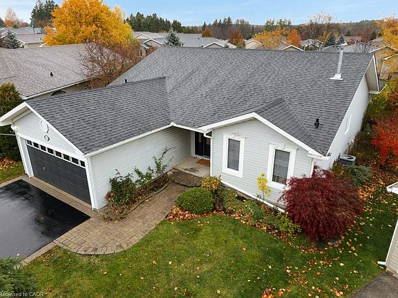 Discover the active, maintenance-free lifestyle you've been looking for. This move-in ready 1,660 sq. ft. bungalow is ideally situated in Antrim Glen, a Parkbridge Adult Lifestyle Community. Enjoy a tranquil, rural feel while remaining just a short 15-minute drive to the amenities of Cambridge or Waterdown. Inside, you'll find an inviting open-concept floor plan highlighted by gleaming hardwood floors & newly installed carpeting. Convenience is paramount with main-floor laundry & a generous sized Primary Suite featuring a walk-in closet & private 4-piece ensuite. The bright, well-appointed kitchen is a delight, offering ample cabinetry, expansive counter space, & a centre island. It is beautifully detailed with quartz countertops, a ceramic tile backsplash & stainless steel appliances. An inviting fireplace in the living room creates a cozy, welcoming focal point. The light-filled sunroom will quickly become your favourite spot, offering seamless access to the private, two-tiered deck—perfect for entertaining. The lower level features a versatile bonus room, ideal for a dedicated home office, den, or gym. The remaining unfinished area provides incredible storage capacity or the potential to create a custom workshop, hobby room, or future recreation space. A double-car garage with convenient inside entry makes everyday tasks like unloading groceries a breeze . Antrim Glen is truly a lifestyle. Residents enjoy exceptional amenities, including a 12,000 sq. ft. Community Centre, a heated saltwater pool, and a full calendar of organized activities that foster a lively & engaging social atmosphere. Monthly fees of $1,211.70 include property taxes, & provide access to all exceptional amenities. Antrim Glen offers a quiet, secure, & supportive environment where neighbours become friends. Seize your opportunity to experience the perfect blend of independence, community, and comfort. Schedule your private tour today!
