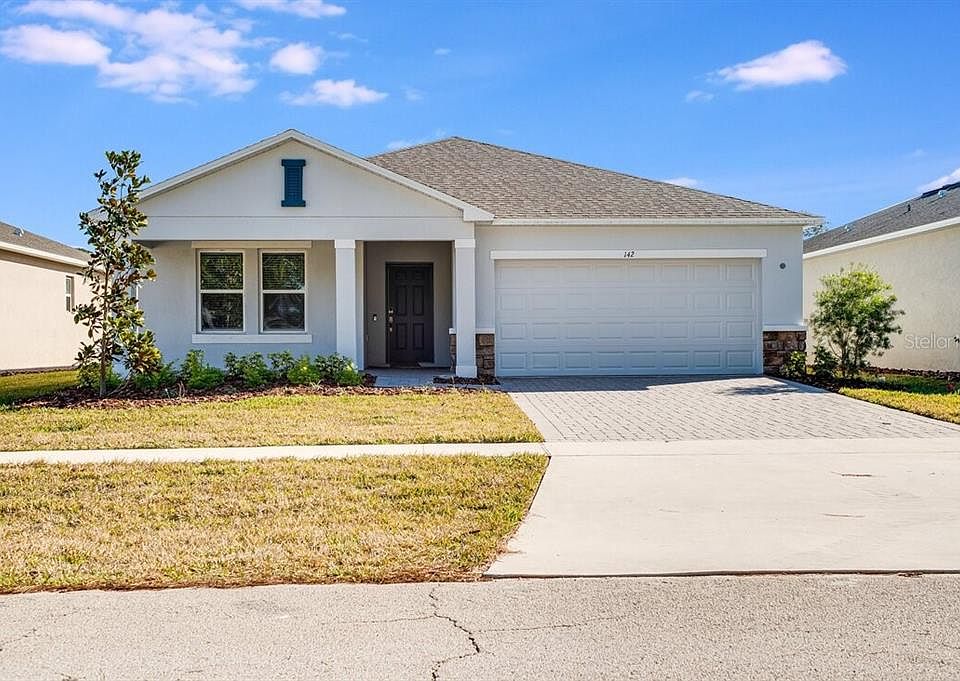 MLS#O6268041 Ready Now! Welcome to the Magnolia at Riverfront! Step through the front door of the Magnolia plan and take in a clear, inviting view straight through the heart of the home. Bright and open, this design centers around an extended entertaining space that includes a dining area, a well-appointed kitchen, and a great room, all seamlessly connected. A sliding glass door leads to the back patio, perfect for outdoor living. The kitchen features a long prep-and-serve island, ample counter space, and a generous walk-in pantry, making it a dream for home chefs and food enthusiasts. Three spacious secondary bedrooms share two full bathrooms, while the private primary suite is a peaceful retreat tucked at the back of the home. Enjoy a luxurious bath with a large shower, dual sink vanity, stylish finishes, and an expansive L-shaped walk-in closet for all your storage needs. Structural options added include: covered lanai.