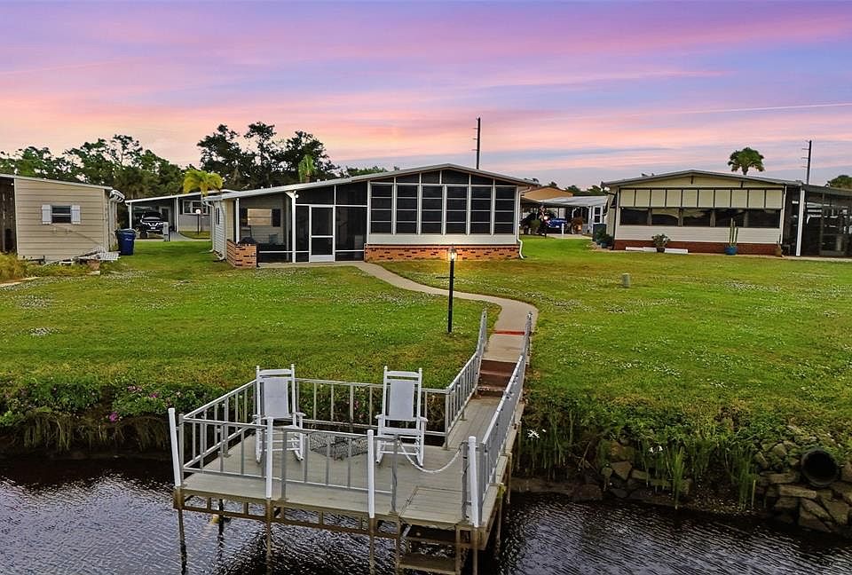 Under contract-accepting backup offers. Welcome to 142 Lazy River Rd, a place where every day feels like a vacation and life moves to the rhythm of the water. Tucked along a peaceful canal just seconds from the Myakka River, this beautifully cared-for home is fully furnished and move-in ready. From the moment you arrive, you’ll feel the calm of a waterfront lifestyle waiting to unfold. Imagine mornings that begin with coffee in the lanai and evenings spent watching soft golden light dance across the water. Step inside and take in the light, open feel that makes this home so inviting. The expansive Florida room along the back of your home has vaulted ceilings captures panoramic canal and lake views, creating a serene space to read, relax, or host sunset get-togethers with friends. Every detail has been thoughtfully updated. The roof, AC, and carport were replaced in 2018, entire carport/porch screened in in 2024, and the flooring throughout has been upgraded to luxury vinyl with ceramic tile in the kitchen and baths. Master/Primary suite has an updated ensuite bath with a rain showerhead and bench seating in your lovely all-tile walk-in shower. Both bedrooms include walk-in closets, and the spacious kitchen features a pantry, breakfast bar, and plenty of cabinet space for those who love to cook or entertain. Soft neutral tones and coastal finishes make the entire home feel crisp, comfortable, and effortlessly Florida. Outside, there’s room to breathe and enjoy. The widened driveway, two storage sheds (one with a washer/dryer), and patio space make it easy to host a barbecue, tinker on a project, or simply relax after a day on the water. Don't forget the roll down sunshades to block sun or just create additional privacy to enjoy all that this intimate screened-in and covered space has to offer! Lazy River Village is one of Southwest Florida’s most sought-after 55+ waterfront communities, known for its warm spirit and endless opportunities to stay active. Residents enjoy pickleball, tennis, shuffleboard, putting greens, a heated pool, fitness center, kayak launch, woodworking shop, and a marina with 38 boat slips available for rent. There’s even storage for your RV, trailer, or boat, so you can bring every bit of your Florida lifestyle with you. Low monthly fee includes lawn care, cable, and internet, keeping your days simple and stress-free. And when you’re ready to explore beyond the neighborhood, you’re just minutes from Downtown Wellen Park, CoolToday Park (home of the Atlanta Braves), Warm Mineral Springs, and the white-sand beaches that make this area famous. Whether you’re dreaming of a sunny winter escape, a full-time retreat, or the perfect place to slow down and savor every day, 142 Lazy River Rd offers the best of waterfront living, comfort, and connection. It’s not just a home—it’s the Florida lifestyle you’ve been waiting for!!