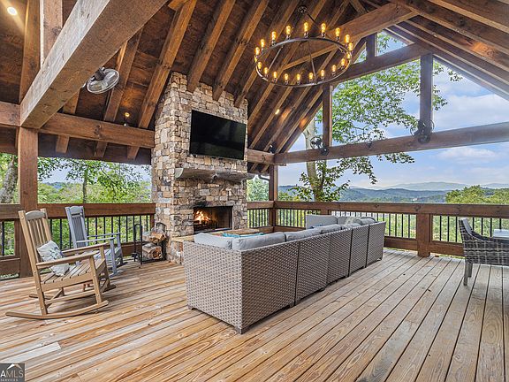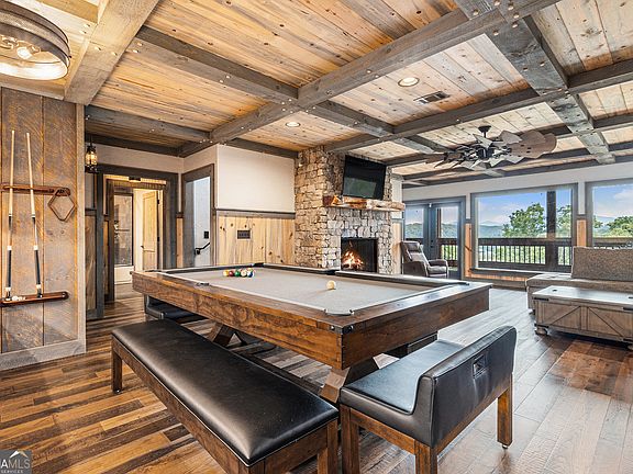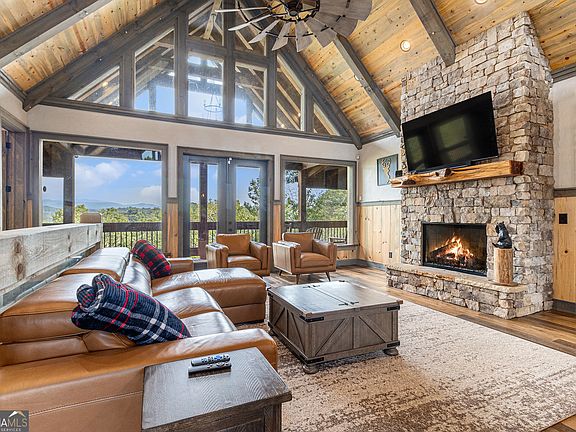 Welcome to this lodge-style home in the North Georgia Mountains, where mountain living meets modern comfort. Step through the mahogany front door into soaring ceilings with exposed beams and Tennessee fieldstone fireplaces. The standout glass wall fills rooms with natural light while showcasing panoramic views of the Cohutta Mountains and Ellijay River, plus front-row seats to Harrison Park's Fourth of July fireworks. This five-bedroom, four-bathroom home features a gourmet kitchen with professional-grade stainless steel appliances and granite countertops, plus a conveniently located laundry room with half bath. The primary bedroom offers a quiet retreat with mountain and river views. The lower level's unique bunk room sleeps five with individual charging stations, personal TVs, and lighting, plus dedicated office and homeschool stations. A climate-controlled wine cellar and humidor provide elegant entertaining space, while the kitchenette features a professional pool table that converts into a dining table for twelve. Outdoor amenities include a covered porch with wood-burning fireplace and outdoor kitchen, an endless pool swim spa with Michael Phelps swim machine and treadmill, plus an outdoor shower. A bed swing on the front covered porch offers peaceful relaxation spots. Located just three-tenths of a mile from downtown Ellijay's restaurants and shops, yet private enough for mountain tranquility. The property includes gracious outdoor spaces perfect for gathering, room to build a garage, and comes fully furnished for immediate mountain living enjoyment. Sold Furnished!