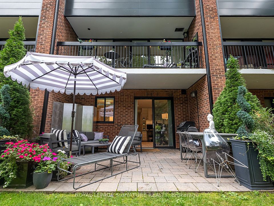 Discover a rare opportunity to own a two-story townhouse-style condo on the serene, tree-lined Pears Avenue, in one of Yorkville's most sought-after boutique buildings. This fully renovated residence offers over 1,450 square feet of contemporary living space - sprawled over 2 floors, blending modern elegance with comfort. As you step inside, the open-concept main floor welcomes you with gleaming hardwood floors, a striking wood-burning marble fireplace, and expansive floor-to-ceiling windows that bathe the space in natural light. The well-appointed eat-in kitchen, featuring granite countertops and custom cabinetry, offers a perfect space for casual meals and culinary creativity. The lower garden level hosts the light-filled primary bedroom, a private retreat featuring an indulgent ensuite bathroom and an impressively large triple closet with sliding full-length mirrored doors, ideal for accommodating even the most extensive wardrobe. Custom adjustable wood closet organizers are featured throughout the home, ensuring every storage need is met with style and functionality. Adjacent to the primary suite is a versatile office/den/guest room, complete with custom cabinetry and a Murphy bed, offering flexibility for various living arrangements. Whether used as a cozy family room or an extension of the second bedroom, this space adapts to your needs. Outdoor living is equally impressive, with 350 square feet divided between a spacious garden terrace and an inviting second level balcony. Enjoy leisurely afternoons, al fresco dining, or entertaining guests in this private oasis, just steps away from the outdoor heated pool. Additional conveniences include ensuite laundry and a separate storage area, making this home as practical as it is luxurious. This one-of-a-kind Yorkville residence combines contemporary style with timeless elegance. Don't miss your chance to call this exceptional property your home, a true HAVEN in one of Toronto's most prestigious neighborhoods.