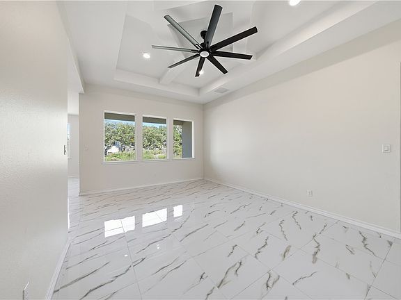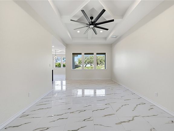 Step inside and fall in love with the bright, open floor plan dressed in high gloss porcelain tile that runs throughout the home, no carpet, no fuss, just seamless luxury underfoot. The living area shines with coffered ceilings, recessed lighting, and an oversized matte-black ceiling fan that gives the room a sleek, modern vibe. The kitchen is pure showstopper, rich espresso cabinetry, gleaming quartz countertops, brushed-gold hardware, and a large center island perfect for meal prep or morning coffee. The space will soon include an electric range/oven and microwave.