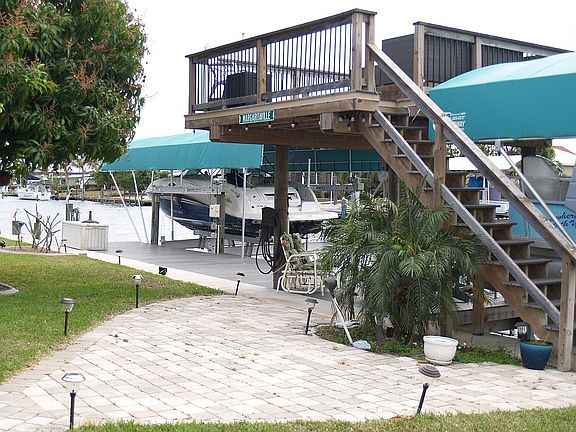 Open Concept home. Completely renovated 2/2 with Den (can use as guest room with sleeper sofa), Beautiful Gourmet Kitchen with lots of storage, wood cabinetry, high end granite, pantry, 36" gas stove with pot filler above. Remote controlled skylight in kitchen. Laundry room is right off of the kitchen. Metal roof 2016. Terrazzo Flooring throughout, tile in MB bath, walk-in closet and guest bath. Both bathrooms have been beautifully renovated. Covered screened in Lanai all across the entire back of the home. Large, heated saltwater pool. Mature landscaping with sprinkler system, Mango, Avocado and Citrus trees, 1 ea. Pavers take you back to the composite dock that also has a Crow's Nest and 2 Covered Boat Lifts, one 6K lb. and one 10K lb. capacity. 100' Seawall replaced in 2018. Original windows have all been replaced with Hurricane resistant windows. 2 car garage with plenty of storage and an epoxy floor! For a Florida home, this home has plenty of storage space.