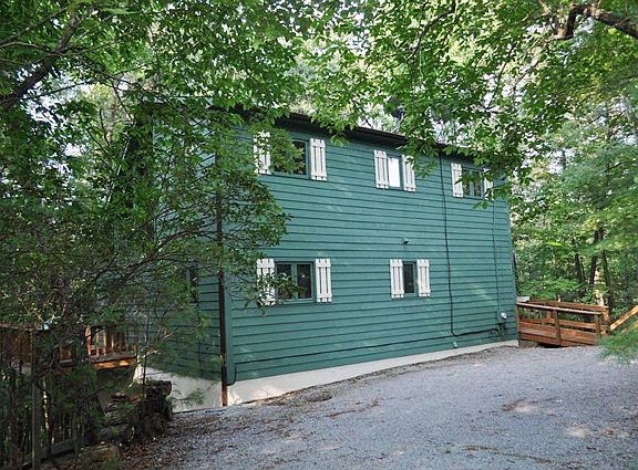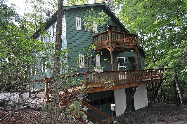 Gem of a home on double, .882 acre, wooded lot. Handicap accessible. Large, open great room & kitchen on main floor. Multiple sliders & windows provide great light. Stately, stone fireplace is focal point. Kitchen offers plentiful counter space & cabinets. Master bedroom w/ full bath on main floor. Upstairs features bedroom, remodeled full bath & 2nd room with closets/windows for office or private sleeping room. Private balcony also hallmarks 2nd floor. Includes all amenities of gated community with pool, clubhouse, a picnic area, three lakes, and hiking trails. Well-maintained home & deck overlook woods. Seasonal view. Neighbors, BUT VERY PRIVATE & SERENE. Adjoining lot below home protects from further development. Circular drive in front plus driveway into an 896 SF, 1-car garage under house give lots of parking. Garage provides tremendous storage space, workshop. Contractor notes 2 options for stairs to basement & approx. $500 to move W/D to basement. Numerous updates: painted exterior, stained decks, flooring, kitchen updates in 2012, remodeled BA.