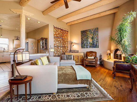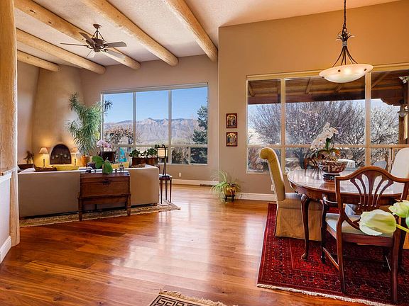 This elegant SW home, with high ceilings, exposed vigas and 6'' wide Walnut hardwood flooring, is invitingly warm and invites the outside in with soaring views of the Sandias.  The large Primary Suite has the second fireplace, a walk in closet and a separate tub and shower.  The '' Guest Wing'', with 2 bedrooms/bath, is in a separate area of the house offering privacy to guests.  There is a shaded, fenced backyard with mature, low maintenance plantings and trees that make the area very private and cool.The street has all modern, custom homes with underground utilities (and no speed bumps).  The neighbors are active in the maintenance of the community and have an annual picnic to share ideas.  This is a rare find at this price range in the safe Village of Corrales.