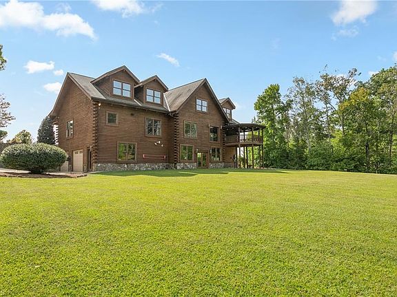 Discover the allure of country living in this enchanting log cabin nestled on 10 acres of private bliss. This home invites you to experience the tranquility of nature without sacrificing comfort. As you step inside, the warmth of exposed beams and vaulted ceilings create a cozy and inviting atmosphere. Gather around the fireplace, creating memories that will last a lifetime. The expansive windows frame picturesque views, bringing the beauty of the outdoors in. The main level primary bedroom provides a peaceful retreat. Yearning for more space? The basement is already rough plumbed and ready to be transformed, this space offers endless possibilities—a potential home gym, entertainment area, or additional bedrooms—the choice is yours. Outside, the expansive grounds provide ample room for outdoor activities. This property offers the canvas for your dreams. Ask your agent about the full list of features in the attachments!