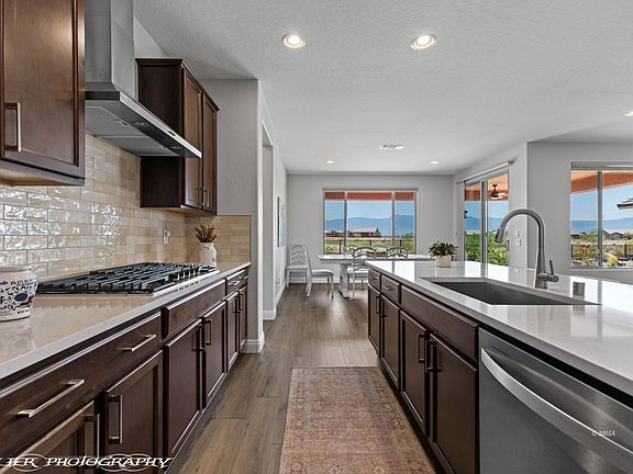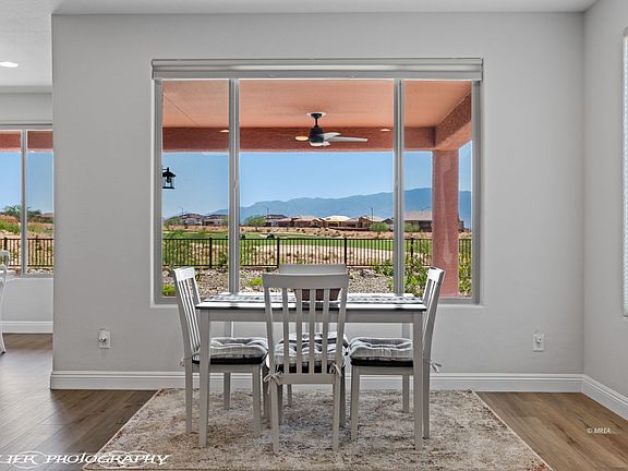 Stunning Home with Panoramic Golf Course and Mountain Views. This immaculate 3-BR/2-BA home is just 8 months old & sits on premium elevated lot offering breathtaking panoramic views of Conestoga Golf Course, eastern mountains & unforgettable sunrises. Expansive windows throughout maximize natural light & scenic vistas. Open-concept is enhanced by wood-look tile flooring with finely detailed grain, delivering warmth of hardwood with a sleek, modern touch. Kitchen is both stylish & inviting with rich brown cabinetry that complements the flooring & adds timeless elegance that feels cozy yet refined. Guest bathroom showcases beautifully tiled tub surround, elevating the overall aesthetic with a clean contemporary finish. Spacious primary suite includes a generous walk-in closet & luxurious ensuite bathroom featuring dual vanities & large, walk-in tiled shower providing a spacious open feel enhancing the bathroom experience. Extended garage offers room for larger vehicles & includes bonus storage area. Step outside to a large, covered patio with paver flooring, ideal for relaxing while soaking in the serene golf course & mountain views. This home is a true gem & move-in ready. Come see it in person to fully appreciate everything it has to offer.