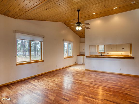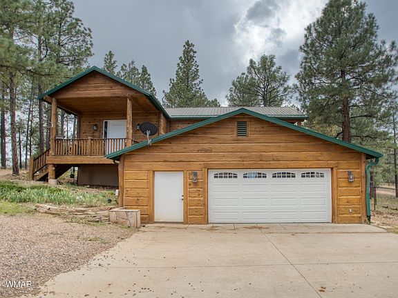 Nestled among towering pines, this beautifully crafted chipped log cabin offers 3 bedrooms, 2.5 baths, and over 2,100 sq ft of inviting living space. Designed for comfort and efficiency, the home features two master suites—one on each level—plus two kitchens for flexible living. The great room showcases tongue-and-groove ceilings accented with reclaimed wood from the Rodeo-Chediski fire, adding warmth and character. With a metal roof, aluminum soffits, and a mix of laminate, tile, and carpet flooring, the property is built for low-maintenance living. Enjoy natural gas forced-air heat, a spacious 2-car garage, a private backyard, and breathtaking views from both the covered patio and balcony—all just minutes from shopping and amenities, yet tucked away from highway noise. NO HOA Home Just needs a Good Staining on the Outside and Fresh Paint on the inside to make it looking Great!