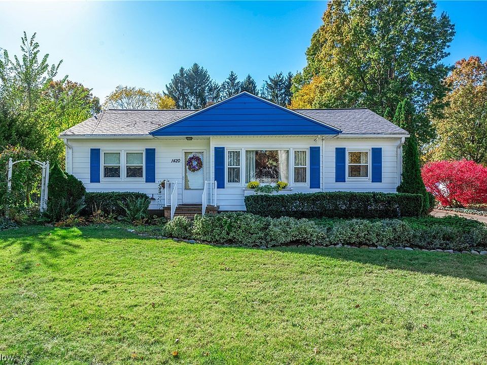 Wonderful three-bedroom, two-bathroom home boasting a sunlit family room. This beautifully updated ranch sits on a spacious wooded lot with a generously sized garage. The family room features cathedral ceilings, a cozy fireplace, skylights, and wood flooring, leading to a new private deck. The ample living and dining areas showcase hardwood floors throughout. The kitchen renovation included updated Shaker cabinetry, Corian countertops, and tile flooring. The main floor bathroom was also updated with a new vanity, Corian counters, a soaker tub, and a large separate shower. Other recent updates include a roof (2021), a new electric panel (2023), and a garage door (2023). Additionally, the finished basement with beamed ceilings offers a full bath, bonus room, and abundant storage space in the utility and laundry areas. The outdoor yard space is parklike with a storage shed and is partially fenced. Located in Green Local School District.