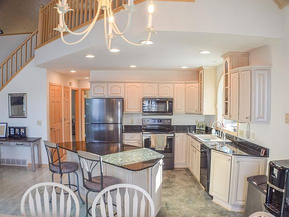 Lake life at it’s finest! Tucked back on a dead-end road, this home will provide you all the peace and tranquility you are looking for. The prime location on the tip of the peninsula allows you to enjoy the beauty of the BOTH the sunrise and the sunset. Walk in your front door to be greeted with stunning full story windows (complete with remote blinds) overlooking your 216 feet of sandy lake frontage. Head on up to your spacious second story loft that overlooks the large, open main living area complete with a breakfast bar, gas fireplace, and patio doors leading out to a beautiful wrap-around deck. On the lower level you will find a fully finished rec room with wet bar, a second full bath, a possible 3rd bedroom or bonus room and a walk-out patio leading directly to the lake.