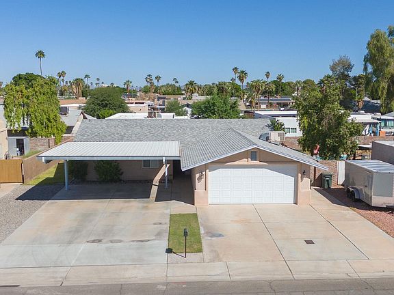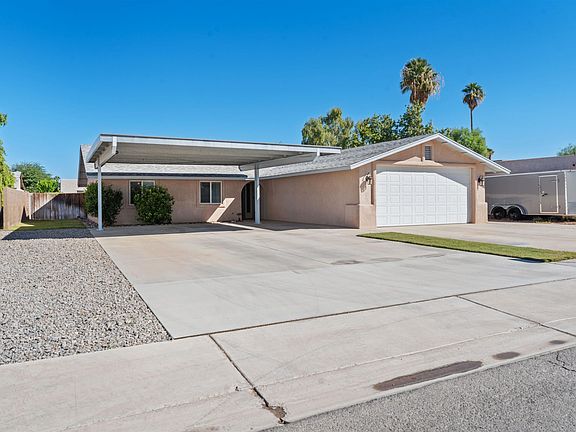 Located in the sought after Palo Verde Estates, this thoughtfully designed 3-bedroom, 2-bathroom home offers a unique blend of comfort and character. Distinct from neighboring properties, it features an oversized garage with generous depth, perfect for accommodating a large truck, boat, or extra storage alongside a custom-built, attached covered carport that adds both functionality and curb appeal. You'll also enjoy having plenty of space to park your RV or 5th Wheel alongside a 50 AMP Hook-Up! Inside, the home welcomes you with a warm and flowing interior, where the living, dining, and kitchen spaces connect seamlessly to create an inviting atmosphere for both quiet evenings and lively gatherings. The kitchen has been tastefully updated with soft-close cabinetry and elegant Quartzsite countertops, offering both style and practicality for everyday cooking. Bedrooms are generously sized, with ample closet space and natural light that enhances the cozy ambiance. With its thoughtful upgrades and welcoming design, this home stands out as a comfortable retreat in a well-established neighborhood. Call to schedule your private tour today!