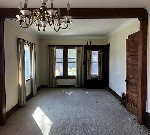 Affordable and well maintained! This bright and sunny 3 bed room home has lots of space. Large living and dining room that features wall of built-ins. Kitchen has cabinet space to spare. Extra room on first floor for office or sleeping space (has closet). 3 bedrooms upstairs all with huge walk-in closets. Large upstairs landing with big storage closet and laundry chute. All carpet is in good shape. Beautiful original wood doors throughout. Charming front porch and cute yellow siding give this home great curb appeal. Enjoy the one-way street with little traffic.
