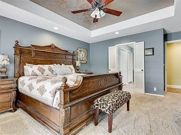 The master suite is separated from the secondary bedrooms. The master has double doors with plantation shutters leading out to the patio. Enter the master bath thru the double shutter doors and you will find a make-up vanity, a large walk in closet, a sauna built into the closet, a large stand up shower, and separate jetted tub. The bathroom features a large skylight for all the natural light you could need!