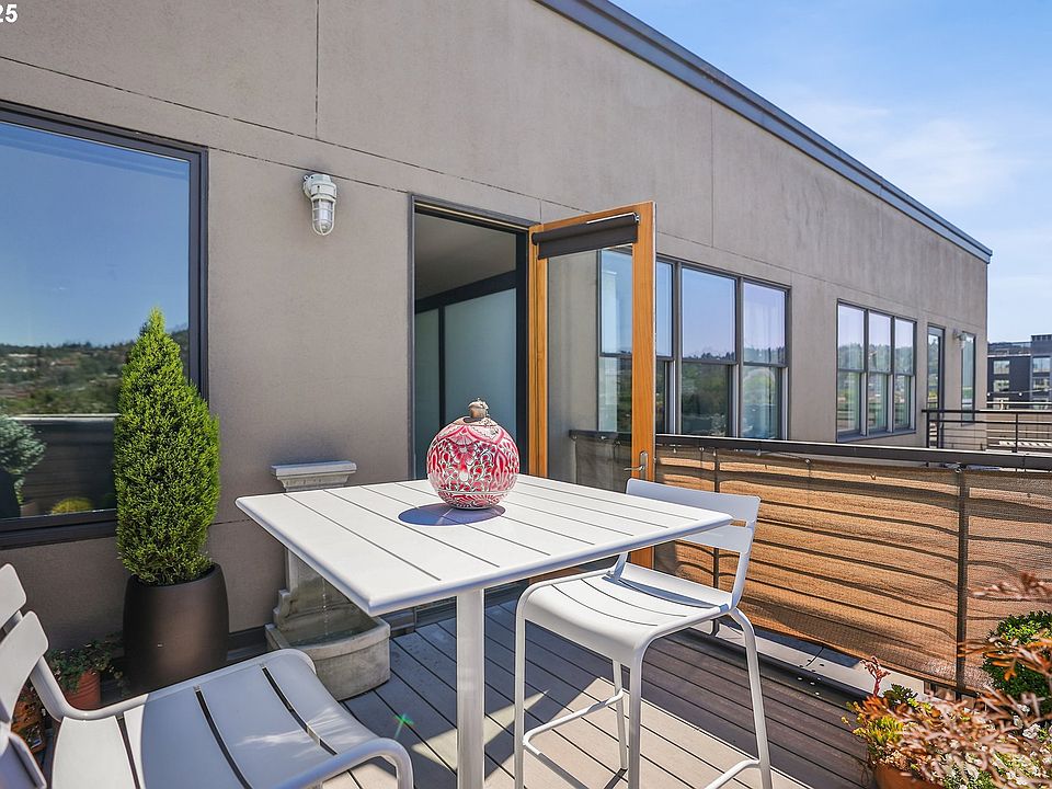 This authentic industrial loft penthouse features soaring ceilings, wood floors, and huge windows that flood the space with natural light. New separately zoned heating and air conditioning units for each level ensure year round comfort. The open-concept main floor is perfect for entertaining, featuring a beautifully updated kitchen with quartz countertops, a gas range with a vented hood, and a spacious kitchen island with seating. A cozy gas fireplace anchors the living area, while a third sleeping area with a custom wall bed and a full bathroom provides flexibility and convenience. Upstairs, the wood floors continue into the private quarters, which include two bedrooms, a large bathroom with a double vanity, a full laundry room, and a spacious walk-in closet. Enjoy expansive views of the neighborhood and West Hills, as well as stunning sunsets and the changing colors of the seasons from the large terrace, primary bedroom, and the main level. The building provides a beautifully landscaped courtyard and a handsome lobby with exposed old-growth beams. Tandem parking for 2 cars and a storage unit are included.