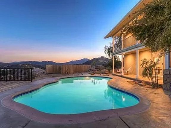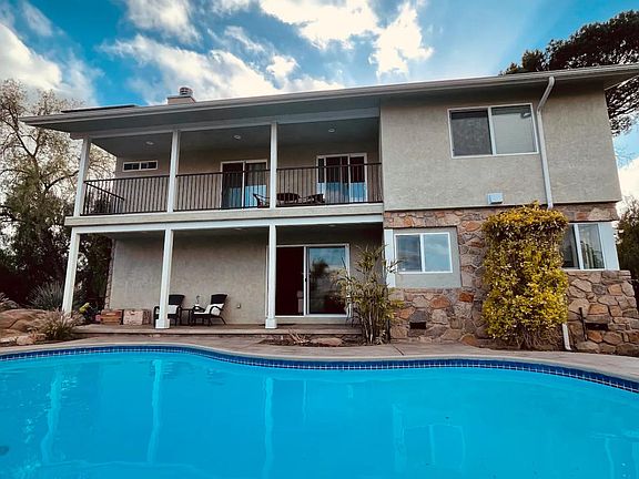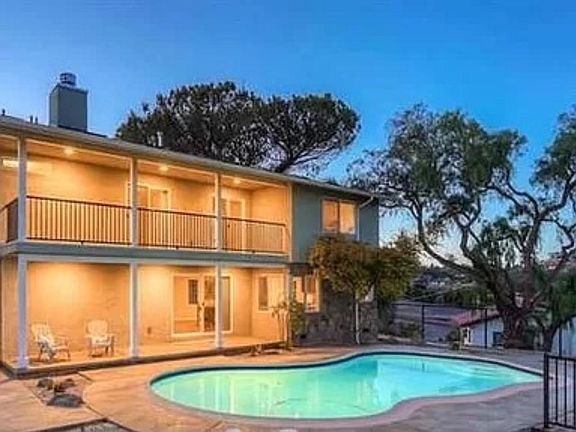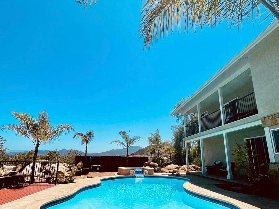 It features 4 bedrooms including 2 MASTER SUITES, one on the main floor, 3.5 baths, a brand new farmhouse style kitchen, a sparkling pool and jacuzzi, on a quiet private street, views and much more! A must see!