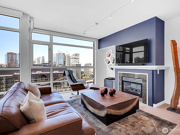 Magnificent NW-facing corner unit, features stunning, unobstructed views of downtown, Lake Union, and beyond! Masterful layout includes floor-to-ceiling windows with NEW RC power blinds. Entirely NEW & updated kitchen (2020). NEW lighting & hardwoods throughout (2020). NEW HVAC system (2025). Fresh paint, gas stove & fireplace. 2 comfy bedrooms, 2 large baths (primary en-suite & walk-in closet). Lots of storage in-unit, plus two large storage units in the garage. Residents enjoy amenities such as full spa, gym, theater, & 24hr concierge for security. Guest suite also available. Includes 2 parking spaces, and guest parking. Walk to Light Rail, Pike Place Market, shopping, restaurants, and much more! Furniture/artwork available for purchase.