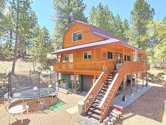 Charming Elk Ridge Cabin with Massive Detached Garage. Mountain Charm at its finest! Introducing a 3-level cabin in Elk Ridge Estates Unit 1, which offers comfort and space for year-round living. The main level features an open layout with a large dining area, cozy living room with an electric fireplace, and an updated kitchen with granite countertops and pull-out drawers. Wood burning flue is installed above electric fireplace for easy conversion. A half bath and laundry room are conveniently placed. Upstairs has the primary bedroom with ample closet space, a guest bedroom, and a bath with tile shower. The lower level features a guest bedroom, full bath, remodeled office, TV room with a sleeper sofa, mechanical room, and a walkout entry. Every mountain cabin needs a garage to accommodate the lifestyle. Adjacent to the cabin is a 1,064 sq ft heated/cooled garage with a half bath, storage, and space for trucks and recreational vehicles. Above the garage is a 448 sq ft finished room with a separate stairway-ideal for storage, playroom, or retreat. Cabin includes electric baseboard heat, two cooling units, a water softener, and a Generac backup generator. Roads are chip-sealed. Take time to view this competitively priced cabin today!