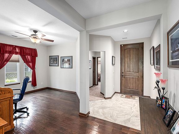 This delightful one-level residence offers a perfect blend of comfort, style, and functionality. Featuring 2 spacious bedrooms, 2 well-appointed bathrooms, a large office, and 3 Car Garage, this home is designed for easy living and entertaining. As you step inside, you'll be greeted by a spacious tiled foyer that leads to the office, hall bathroom, and second bedroom. The foyer opens up into a bright and airy great room that seamlessly connects the kitchen, dining, and living areas. The modern kitchen is a chef's delight, boasting stainless steel appliances, a large island perfect for meal prep or casual dining, elegant granite countertops, and a large walk-in pantry for ample storage. The wood flooring throughout the common areas adds a touch of warmth and sophistication, while the bedrooms offer cozy carpet for added comfort. The living room is anchored by a gas fireplace with bookshelves on either side and overlooks the covered porch. The master bedroom is situated at the back of the home, offering privacy and tranquility. The attached master bathroom is a luxurious retreat, featuring a large walk-in shower. All doorways in this home are wheelchair accessible, ensuring ease of movement for everyone. Step outside to the covered patio, which overlooks a lovely backyard filled with mature trees, providing a serene and private outdoor space. The laundry room includes a doggy door leading to a separate patio and fenced area, perfect for your furry friends. Located in the beautiful Auburn Hills Golf Course community, you'll enjoy access to the clubhouses and swimming pools. The Goddard Eisenhower schools are top-notch, making this an excellent location for families. This singe family home has all the amenities needed to age in place comfortably, but it is not a patio home, so you won't have high monthly hoa dues. Plus, you have an oversized 3-car garage for extra storage that most patio homes don't offer! Don't miss the opportunity to own this beautifully upgraded home that combines modern amenities with a comfortable, one-level layout. Schedule your private tour today and experience the charm and convenience for yourself!