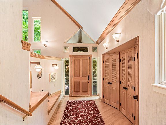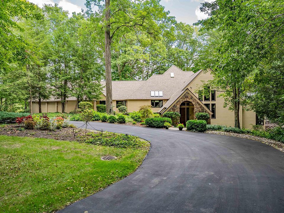 NEW PRICE!! Live your dream in this one-of-a-kind 6-BR, 6100 sq. ft. contemporary beauty on a walk-out lower level. Ideally located in the highly sought-after Devils Hollow neighborhood and nestled at the end of a cul-de-sac on 2-lush private acres in Southwest Allen County School district. Custom built by boutique architect George Emmert and commercial builder D+C Construction, this architectural marvel boasts a multi-level open-concept floor plan and windows at every turn bathing the home in natural light and allowing the outdoors to be your design backdrop. Created for easy living and entertaining, the main floor features a spectacular circular living room w/ soaring ceilings & a full masonry gas fireplace, a fabulously renovated sunroom, dining room w/wet bar, a large chef's eat-in kitchen w/fleet of gourmet appliances and adjoining hearth room, beautiful built-ins, and an amazing circular staircase leading to a large private office (or 7th bedroom). Also on the main level, the renovated primary en-suite is a haven w/dual closets and vanities, and large tiled walk-in shower. The Jack 'n Jill bedrooms w/walk-in closets share a renovated full bath, and the extra large laundry room can serve double as a butler's pantry. You'll love the sliders to two outdoor decks overlooking your backyard oasis from both the kitchen area and the sunroom. Head to the walk-out lower level either by circular staircase from the kitchen, or off the sunroom, where 3 more bedrooms w/walk-in closets, 2 full baths, another full masonry (wood-burning) fireplace, full bar area, and large rec/living space await you. Other bonus features include all natural hardwood floors, storage galore, skylights for natural light, 4-car garage, new roof 2014, new driveway 2021, new cedar siding in back 2024, new well 2014, and most windows replaced in the past 10 years. There are two fabulous open green spaces on the property for playsets, firepits, entertaining and recreation, along with direct access to one of Devil's Hollow's largest ponds...fishing, canoeing, kayaking and living your best life. Devils Hollow is a lifestyle neighborhood featuring 7 neighborhood ponds, and tennis courts.