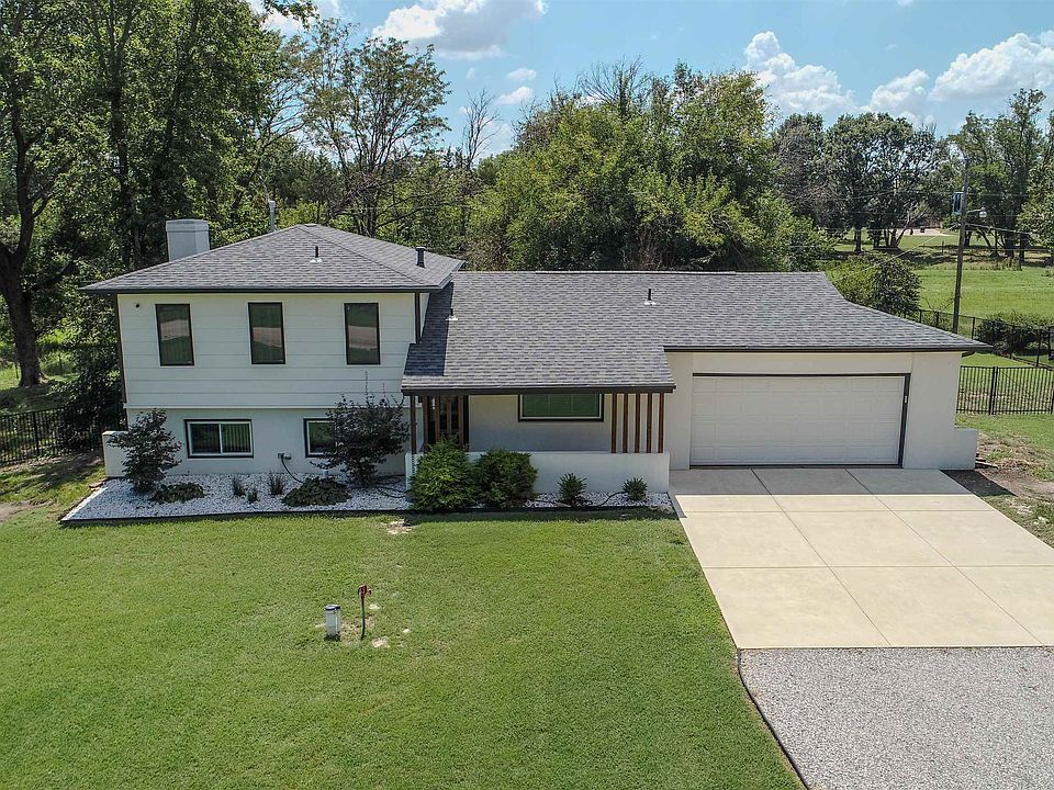 4 bedroom, 3 bath home with a 2-car garage on over half an acre with a wooded lot, located in a peaceful community in the Goddard School District. This beautifully updated home features a new stucco exterior with wood accents, new lighting, and a new driveway. The property includes a new wrought iron fence, a new storage shed, and rerouted exterior drainage. Inside, the home has been completely renovated with new sheetrock, paint, and new bamboo flooring throughout. The kitchen and bathrooms have been fully remodeled. Additional upgrades include a new roof, a new electrical panel and wiring, new attic insulation, and motorized shades in the living room.