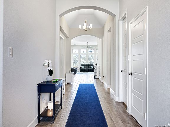 Stunning Perry Home in Stevens Ranch! This one-year-new Perry home offers 4 bedrooms, 3.5 baths, and 2849 sq. ft. of modern living. With 12-ft ceilings and an open concept layout, the home features a gourmet kitchen with five-burner gas cooktop, large island, and ample cabinetry. A private guest suite with a full bath adds convenience, while the spacious game room is perfect for work or play. Enjoy an oversized backyard that backs up to a greenbelt for privacy plus an extended covered patio with no back neighbors. Conveniently located near 211 & Potranco, just minutes from HEB, 12 minutes from golf courses and zoned in the highly rated Northside ISD. Don't miss out on this incredible opportunity- schedule your showing today!