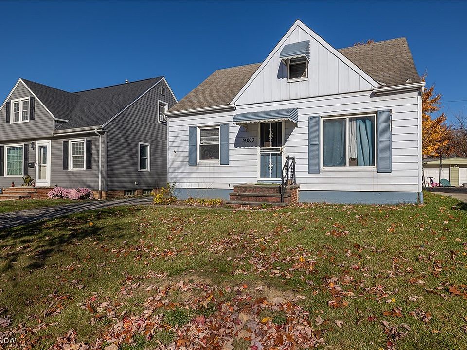 3-bedroom Maple Heights Bungalow with wood floors and neutral paint. Eat in Kitchen with tile floors. Two first floor bedrooms with wood floors and ample closet space. Bright and renovated first floor bathroom. Third bedroom on the second floor with additional seating area and large storage closet. Patriarchally finished basement with decorative fireplace. 1 car garage.