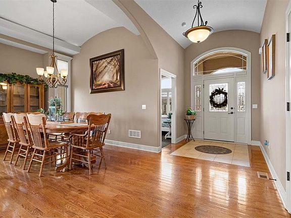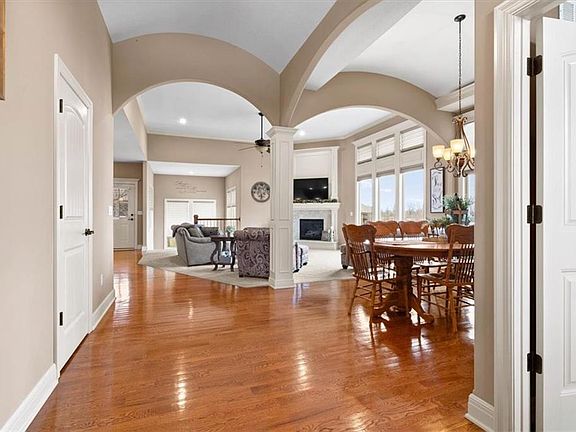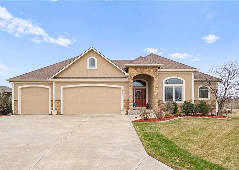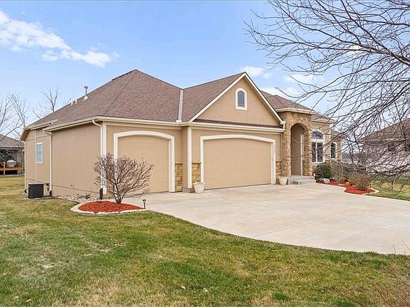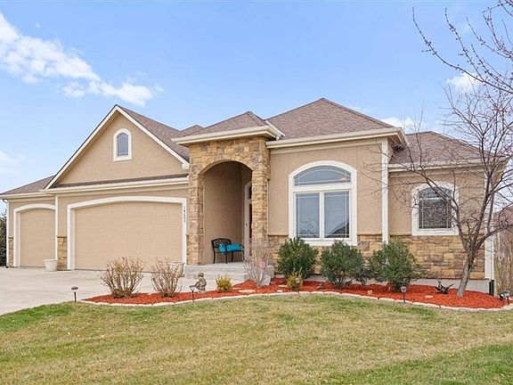 Beautifully maintained executive home in a GOLF COURSE community with fantastic LAKE VIEWS from the kitchen, living AND dining rooms! (More photos coming soon.) Tons of space in this reverse 1.5 story home with all rooms generously sized. The quality is immediately evident with upgraded trim, leaded glass front door and sidelights, custom blinds and much more. As soon as you step inside, you will be wowed with the open and inviting living space with the spectacular view of the lake. The living room includes a gas fireplace and the dining room is open and spacious with attractive up-lighting. The kitchen is also open and well appointed with Kitchen Aid appliances, including a double oven and 36 inch gas cooktop and has a second eating area. The pantry is definitely large AND has a door for loading groceries from the garage - very handy! The primary bedroom includes multiple box vaults, upgraded trim and a door to the covered deck. In the primary bathroom you will find a double vanity, beautiful walk-in shower, large tub and spectacular master closet!! Rounding out the main floor are a guest bedroom with ensuite bathroom, the laundry room and a half bath. Downstairs a large and open family room with another gas fireplace and a bar/entertaining area provide ample space to spread out or entertain. There are two additional bedrooms and full baths as well as storage on this level. Walk out to the extended patio with plenty of space for fabulous outdoor living - again, with a view of the lake!! Falcon Lakes is conveniently located off K-7 with easy access to all parts of the metro area. It is just 10 minute to the Legends Shopping and Entertainment district and just 30 minutes to the airport, downtown and even Lawrence.