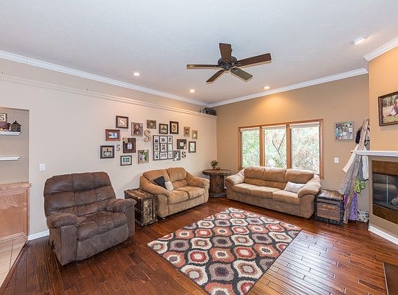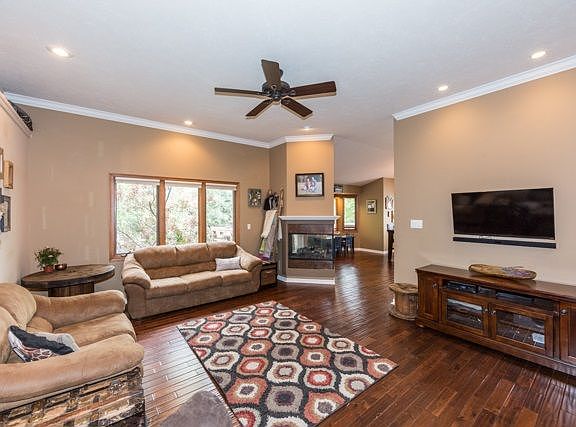 You will love coming home to this move-in ready ranch which features a great floor plan for easy entertaining, hardwood floors, warm and inviting living room with large windows, recessed lighting, ceiling fan, 3-way fireplace and display shelves. The spacious kitchen features tile flooring, island, pantry, all the appliances to remain, newer over the cabinet lighting, ceiling fan, recessed lighting, and open to the dining room which includes a three-way fireplace, large windows, chandelier, and door to the deck to make outdoor entertaining a breeze. The master suite will be your little oasis and is complete with carpeting, ceiling fan, neural decor to go with any decorating idea you might have, and private bathroom with corner soaker tub, his and her vanities, separate shower, private commode, and large walk-in closet with great built-ins. The finished basement is the perfect space to just hang out and features a recessed area for your TV, large viewout windows, decorative ledge, recessed lighting, and wet bar. This lower level also features two spacious bedrooms, a full bathroom, and a fabulous storage room with built-in shelving. Sit back and relax this summer out on this wood deck overlooking the private backyard with wood fencing and newer side patio area! This finished garage includes enough room for 3 cars, epoxied flooring, and cabinets! Seller has made many improvements to home since ownership including pocket door from laundry to kitchen, crown molding in living room, interior paint, recessed lighting in basement family room, new concrete walk way on west side of house, and various other cosmetic touches that really make this home shine! Truly a must see!
