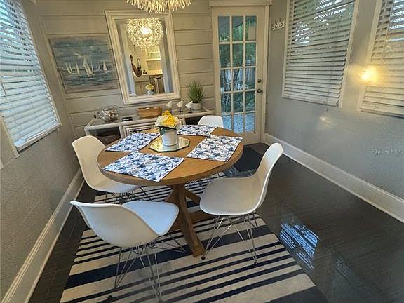 Adorable bungalow home, lushly landscaped in the popular Northeast Corridor of St. Pete! Conveniently located near downtown and all the shops, markets & restaurants on 4th St. It has been lovingly maintained and has new Luxury vinyl flooring. Kitchen features light and bright cabinets to ceiling with molding, subway tile backsplash, porcelain tile flooring & Cambria Quartz countertops. There is a built-in wine cabinet, farmhouse sink with spring neck faucet & stainless-steel appliances that complete the very modern look. Bathroom has marble flooring, including the shower. The shower features a rainfall shower head + handheld, and recessed LED lighting. Light & bright dining room area features porcelain tile & a French door leading to the serene, fully fenced back yard. The back patio lanai is a great entertainment area surrounded by lush tropical plantings. Well water designated for front and back sprinkler system. New electric tankless hot water(2022), New stack washer/dryer(2022) included, HVAC (2019) Back yard has alley access, and a beautiful private additional parking area that is ideal for a small RV or boat or 2nd car! Front driveway parking has pavers. This property is situated in zone C and has not and did not flood during last storm! Broker/Owner