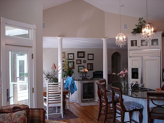 Contemporary cottage style exterior with largely open floor plan on first floor. Master suite on 1st floor. Home office with built in desk and storage. High ceilings/vaulted ceilings. Large screened porch with slate floor and ceiling fans. Large AZEK deck in 2013. 25' motorized awning with Sunbrella fabric, auto retraction and deployment with rain sensor in 2016. New backyard landscape (2016) with water feature, water fall, state of the art architectural landscape lighting. Finished room over garage with built in window seating and storage. Maintenance free brick and Hardiboard exterior with AZEK trim. Copper gutters and roof valleys. Great entertaining home. • 1.6 Acres • Bermuda grass with lush landscaping featuring wood chip mulch • Huge aggregate driveway with extra parking • Stamped concrete walkway to stone porch flanked by columns • Bull-nosed brick detailing • Concrete Board exterior with Cedar shutters that feature wrought-iron hardware • Cedar Shake Shingle detailing in Gable Ends • Anderson Windows are full length allowing natural light throughout the home • Copper valleys, gutters, and box bay roofing • Architectural dimensional shingles • Over 3,600 square feet of luxury detailing • Foyer with mahogany and walnut inlay design • 9 foot ceilings throughout ground floor • wide-open design with columns and/or islands defining areas all of which overlooks a private screened porch and wooded one acre backyard • 4 bedrooms, 3.5 baths, home office, formal living, great room, plus exercise or kids room on second floor as well as incredible storage • Great room with cathedral ceiling, skylit kitchen, antiqued cabinetry with lots of glass display areas and built-in shelving. Granite covered bar seats 4 or more. • Kitchen area features granite countertops, 8 burner gas cook top with griddle and grill, convection oven, beautiful tile design over cook top with commercial ventilation and decorative arched cooking hearth cover, plus 8 x 3’5 pantry, and wine cooler and opens to a stunning breakfast and living area and home office. Finished garage with gorgeous epoxy floor, wall organization system, commercial grade workbench and cabinetry. Whole house emergency generator on natural gas. • All plumbing fixtures are brass and copper fitted with beautiful finishes • Screen porch is slate covered and overlooks a brick-walled AZEK paintless deck. • Master suite features tray ceiling with recessed lighting, built-in speakers, full length shelving in sitting area, access to screened porch, 3 large closets, and sumptuous marble bath with his and her pedestal sinks with custom wall storage, huge sleek soaking tub, and stucco coated walls all in soothing colors and lots of glass. • Children’s rooms / additional office space located down private hall near the stairway to second floor • All natural gas (on demand hot water, furnace, cook top) • Solid core doors throughout with brushed nickel finish • Plywood sheathing • Radiant barrier at roof sheathing reflects heat to make home more energy efficient Neighborhood Description Area of mid to upper level homes, convenient to elementary school and public park, great for walking, bike riding, etc., golf carts permissible, quiet and safe, town has own full time police force, close to fire department, mixed community of young, mid age, and older families, convenient to shopping and to Downtown New Bern, country club and yacht club near by, mature trees and landscaping, excellent town government (Trent Woods)