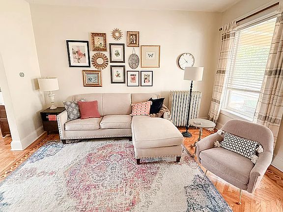 SO RARE! SPACIOUS 3 STORY RENOVATED CARRIAGE HOUSE ABOUNDING IN SPACE AND CHARM WITH ALL THE MODERN AMENITIES YOU COULD ASK FOR--BRAND NEW EAT-IN KITCHEN W/ QUARTZ COUNTERS, SS APPLIANCES (INCLUDING DW), LG LAUNDRY, HEATED FLOORS, 2 PARKING SPACES AND MORE! Welcoming front porch leads you to sunny 28 x 11 living room with gorgeous inlaid floors, 9' ceilings and panoramic views of surrounding garden. Also on the first floor, a newly renovated bath with soaking tub and bedroom. Lower level is home to the massive 18 x 13 NEW kitchen with room for 6+person table! Next to the kitchen, find the family room, laundry room, second full bath, storage room and tiled mud room with convenient second entrance to the shared yard. The top level of the carriage house is home to the huge 15 x 16 primary bedroom with sitting area, dresser space and WIC. The third full size bedroom is also on the top level. All of this conveniently located near shopping, restaurants, schools, bus and train lines