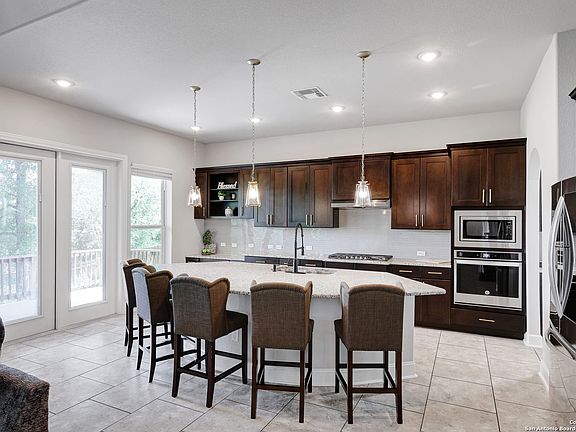 Assumable VA Rate 2.75 inquire for details. This stunning 5-bedroom home offers a blend of elegance and functionality, nestled on a serene greenbelt lot. Step into the heart of the home-a gourmet kitchen featuring granite countertops, gas cooking, a large breakfast bar, and abundant cabinetry. A spacious pantry and additional prep area make it perfect for everyday living and entertaining. The open-concept layout flows seamlessly into the family room, while tile flooring throughout the main areas adds style and durability. A grand staircase with soaring ceilings and a charming Juliet balcony makes a dramatic impression. Enjoy the flexibility of a bonus room, dedicated study with a built-in window seat, and generously sized bedrooms. The private primary suite is tucked at the back of the home with peaceful views of the mature tree-lined yard and greenbelt. Outside, unwind on the spacious covered patio and take in the natural beauty all around. Located in the sought-after Stevens Ranch community with amenities including a pool, jogging trails, and play area. Conveniently close to Lackland AFB, shopping, restaurants, and theaters. Don't miss your chance to make this exceptional home yours! ________________________________________