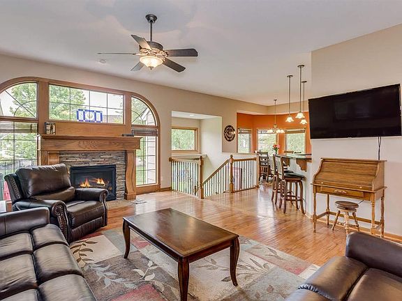 This gorgeous home features an exceptional open floor plan with upgraded features, fantastic living space, and an amazing cul-de-sac lot and location. The main floor is so inviting with stunning wood floors throughout the spacious living, dining and kitchen areas, including expansive windows providing brilliant natural light. The living room features an outstanding gas fireplace with striking stacked stone and beautiful custom wood accents, surrounded by beautiful windows overlooking the backyard. The living room is open to the dining area providing wonderful space for family gatherings. The well-designed kitchen is impressive with abundant cabinet and counter space, large granite eating bar, corian-type countertops, full tile backsplash, large walk-in pantry, and all appliances â refrigerator, range/convection oven, a second built-in oven, microwave, and dishwasher, with an additional dining area including more great windows overlooking the side and back yard areas. The spacious master suite features wonderful space for large bedroom furniture, vaulted ceilings, a large walk-in closet with additional high, seasonal hanging space, and a spa-like bathroom with dual-sink vanity, large soaker tub, oversized shower, and a beautiful tile floor with stone accent inlay. The main floor also includes two additional bedrooms with an adjacent full bathroom with tub/shower and large vanity with a high-edge sink, awesome sun tunnel and tile floor, and a separate laundry room with folding counter and great hanging space. This popular mid-level plan provides the main floor and viewout basement with amazing natural light. The finished basement features more great living space with a huge family and recreation room â perfect for media viewing and game tables, along with a captivating wet bar which includes built-in wine cooler and small fridge, eating bar, wood-look tile floor and a wine cellar! The basement also includes two additional large, viewout bedrooms, a third bathroom with tub/shower and tile floor, a cedar closet and awesome storage space. The well-maintained appeal of this beautiful home continues to the exterior with a manicured lawn with gorgeous stone-lined landscaping area, full wrought-iron fence, sprinkler system, irrigation well, garden area and stone-terraced steps from the garage to the backyard patio. This beautiful home offers outstanding indoor and outdoor living areas to enjoy year-around with family and friends!