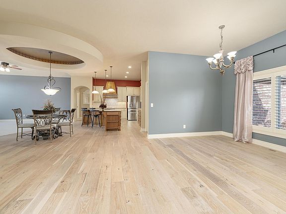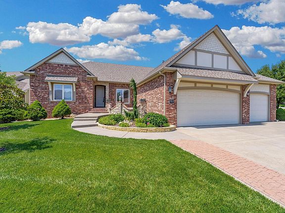 Discover this stunning home in the Auburn Hills Addition of West Wichita! Boasting 5 bedrooms, 4 bathrooms, and a 3-car garage, this spacious 4009 sq. ft. beauty sits right on the golf course! The open-concept layout includes a formal dining and living room, casual dining space, and a large family room with a cozy gas fireplace. Brand new wood flooring throughout main floor living areas. The kitchen is equipped with newer appliances, a roomy granite counter island with an eating bar, plenty of pantry space, and a generous 8x14 laundry/drop zone room. Maple cabinetry and woodwork throughout with wide white enameled trim work. The master suite offers double vanities, a separate tub and shower, and a huge custom California closet! The second bedroom comes with a built-in desk and walk-in closet. The Hunter plantation blinds and window coverings give this home such charm and beauty! The finished basement features a massive family room, walk-up wet bar, and game room. It also offers a split bedroom layout with 2 separate bathrooms, additional storage rooms and a built-in stereo speaker system which includes the basement, enclosed rooms and back exterior patio. The garage includes a spacious work area with epoxy floors. Outside, enjoy beautiful landscaping on the 17th hole of the golf course, located on the west side of the cart path with just one neighbor for added privacy. An enclosed deck/sunroom off the main floor living area provides the perfect spot to relax. The walkout basement "pit" area is enclosed as well for your privacy. Plus, the home features a newer impact-resistant roof, 2019. New HVAC system and water heater in 2021. Freshly painted interior. Exterior painted in 2019 with "Rhino Shield Ceramic Coating", which has a 25 year transferable warranty! Auburn Hills offers fantastic amenities, including multiple community pools, clubhouses, and playgrounds. Don't miss out on this meticulously maintained home and NO special taxes! All information deemed reliable but not guaranteed.