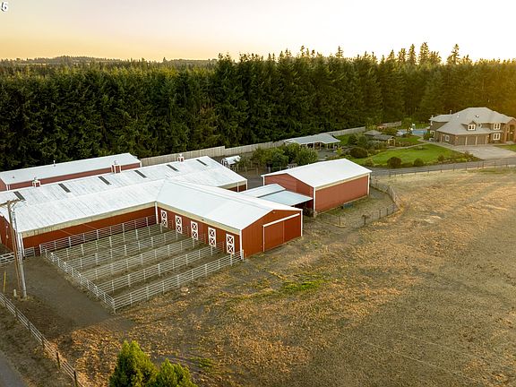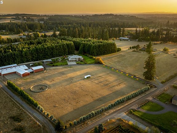Farm Resort Equestrian Estate on 6.54 Acres! A rare blend of country charm and resort-style living, this estate offers everything from equestrian excellence to effortless entertaining/events just minutes from town. The backyard is designed for relaxation and gatherings with an year-round expansive covered outdoor living space; with fireplace, infra red heaters, sprawling paver patio, in-ground pool, hot tub, outdoor sauna, and ambient lighting. Equestrian facilities include a 7-stall barn (5 with paddocks), a 70x120 indoor arena, heated tack room, wash station, hay loft with conveyor, LED lighting, and a 36x48 four-bay implement building. For the multi-hobby lifestyle, a massive 80x30 shop offers 220v power, covered parking, and RV hookups for water, sewer, and electricity; plenty of room for projects, storage, and adventure gear. Tucked privately behind the shop is a 2-bedroom ADU/guest house for added flexibility. The 4,133 SF home blends comfort and elegance with a gourmet kitchen featuring granite counters, Wolf induction cooktop, island, and breakfast nook; a spacious family room with gas fireplace; formal living and dining rooms with soaring ceilings; a main-level office overlooking pastoral views; and a well- equipped laundry with cabinetry and sink. Upstairs, the primary suite includes heated tile floors, a spa-style soaking tub, multi-spray shower, and oversized walk-in closet.Homestead touches include raised garden beds and a chicken coop, with potential income opportunities through boarding, shop rental, or Airbnb. Enjoy sweeping territorial views, stunning sunsets, and the convenience of being just 25 minutes from PDX. Bring your horses, cars, and guests. This farm resort is ready for its next chapter of unforgettable living.