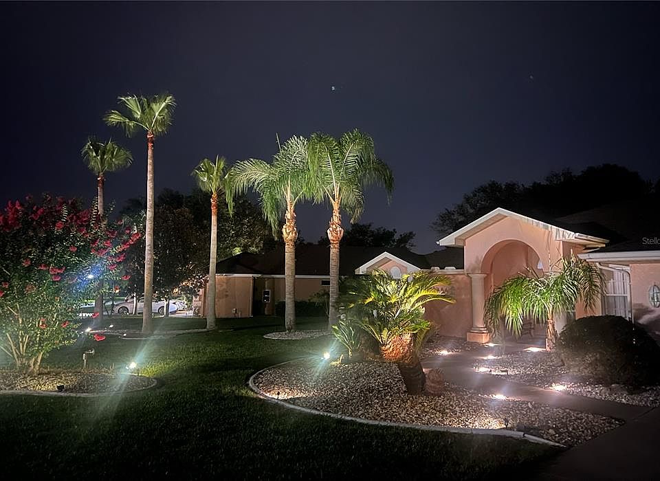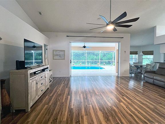 Stunning open concept pool home with 3 bedrooms and 2 1/2 bathrooms in the lovely Pristine Place gated community on a spacious ½ acre lot with private wooded back yard. Enjoy the large sparkling pool area, rain or shine, with a covered lanai/barbecue area which can be expanded into the living/great room by opening the 12 foot wide sliding patio doors. Set the mood by listening to your favorite tunes on the built-in music center that has both inside and outside ceiling speakers. Pool/lanai features an outside shower and an air conditioned ½ bath with a convenient changing bench. Notice the great curb appeal at night with stunning accent lights on the palm trees. The tall covered grand entrance porch has two majestic pillars that frame the pretty oval glass decorated double entrance doors. Enter the home and be awed by the spacious cathedral ceilings, the beautiful wood floors that run from room to room, and the pool view on the other side of the open concept great room. Upgraded kitchen has bright diffused lighting as well as recessed lights, lovely granite countertops and backsplashes, plus a breakfast bar open to the living/dining/great room. Custom cabinetry includes a built-in desk with overhead lights, cabinets and a bookshelf with dividers. Enjoy your morning coffee in the kitchen dining nook overlooking the backyard pool or step out the door and enjoy your breakfast poolside. Spacious primary bedroom has sliding patio doors to enjoy the pool view, a comfortable ceiling fan, mirrored doors on the large walk-in closet and double wide closet in the hall leading to the lovely large ensuite bathroom which has 14 feet of granite countertops, three large mirrors, two sinks, and a make up vanity. Relax and enjoy the ensuite bathroom jetted garden bathtub or use the large separate walk-in shower. Special features include lovely bright glass block window, marble look tile floor, space saving pocket entrance door, a good size linen closet plus lots of storage in the lower cabinets and drawers. Oversized two car garage has a workbench with pegboard, storage cabinets, two cedar lined closets, pull down stairs to access attic storage and a side entrance door. Upgrades include a new range and dishwasher, new architectural shingle roof (2025) as well as a recently re-screened pool enclosure and a new garage door in 2017. Conveniently located just off the Suncoast Parkway, Pristine Place provides easy access to the vibrant Tampa area, with its shopping, cultural, and recreational attractions. Don’t miss your chance to live in this lovely sought-after community which has a tennis court, playground, community pool, library, exercise and meeting rooms. This well-maintained home blends modern updates with timeless style, offering the perfect retreat for relaxation or entertaining and has an assumable 2.5% VA loan to boot! Don’t miss your chance to live in this sought-after community. Schedule your private showing today!