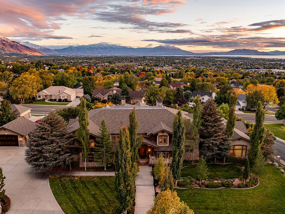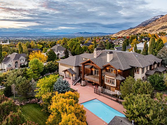 This remarkable lodge-style home in Lindon sits above the valley with impressive views of Utah Lake and the surrounding mountains. With nearly 17,000 square feet, it offers exceptional space for both everyday living and large gatherings. The main level centers around a spacious great room highlighted by a massive stone fireplace and large timber beams, with doors that open to a generous deck overlooking the valley and lake. The kitchen and dining areas are open and inviting, designed for entertaining and connection. There are ten bedrooms, multiple family rooms, and comfortable spaces for both relaxation and recreation. The home includes an indoor basketball court, an exercise room, a game room, a resort-style swimming pool, an additional detached garage, and beautiful outdoor areas with mature trees that take full advantage of the setting. Every aspect of the property reflects a sense of scale, comfort, and livability that is hard to find. It is a rare opportunity to own a home that blends mountain architecture with modern function and lifestyle in one of the most desirable areas of Utah County.